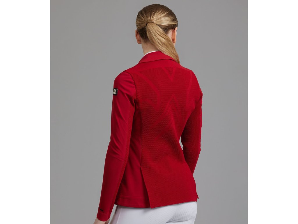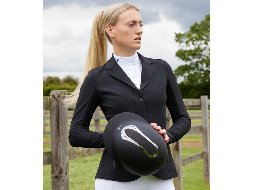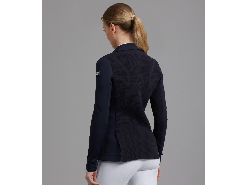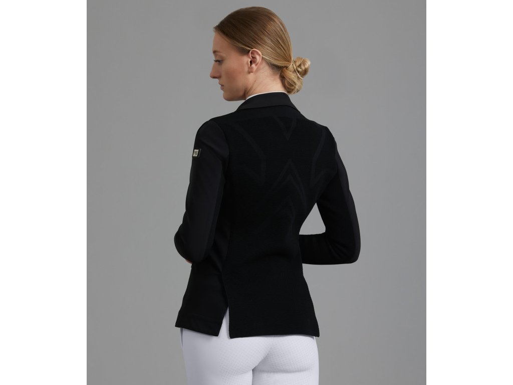 Tato dámská závodní bunda je ideální pro širokou škálu jezdeckých disciplín. Zúžení tohoto inovativního designu kombinuje panely z různých technických tkanin. Přední strana této bundy je vyrobena z lehkého elegantního materiálu, který je luxusně měkký na dotek a příjemný na dotek. Záda a paže, vyvinuté pro moderní jezdce, obsahují technický 3D úplet, který je tvarován podle svalnaté anatomie zad a ramen jezdce. Tato inovativní konstrukce umožňuje větší volnost pohybu a zároveň vytváří bezkonkurenční prodyšnost, která je ideální pro intenzitu soutěže.