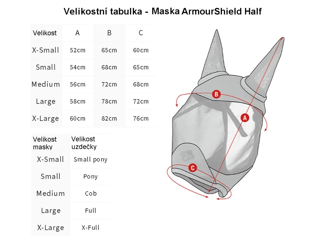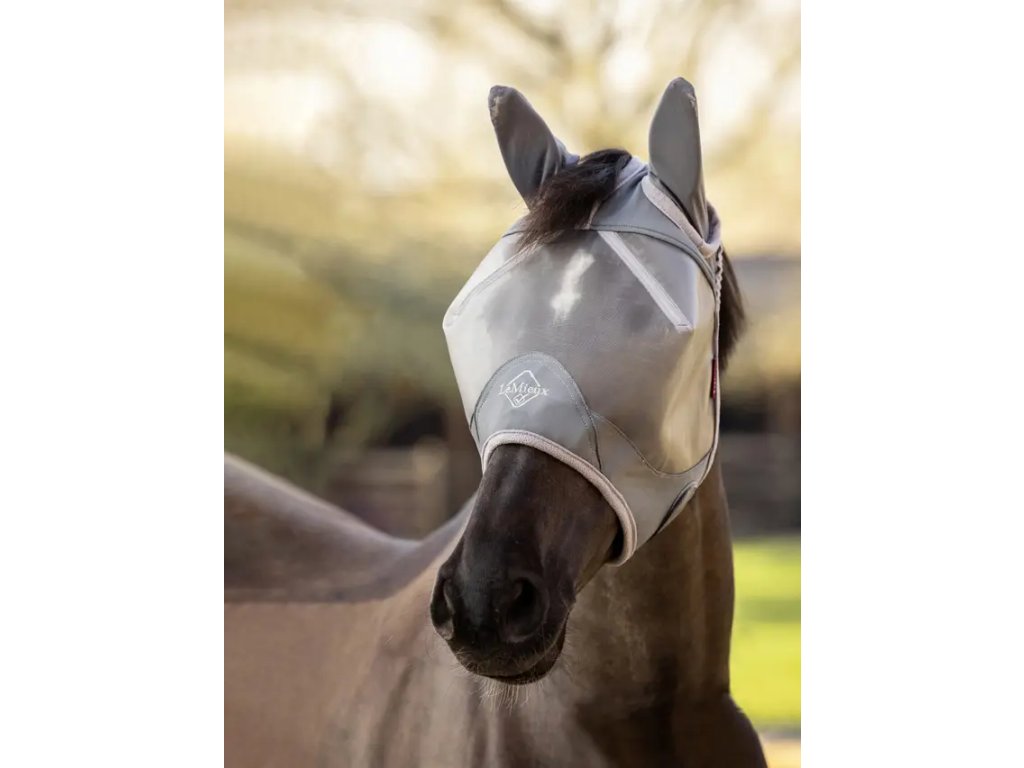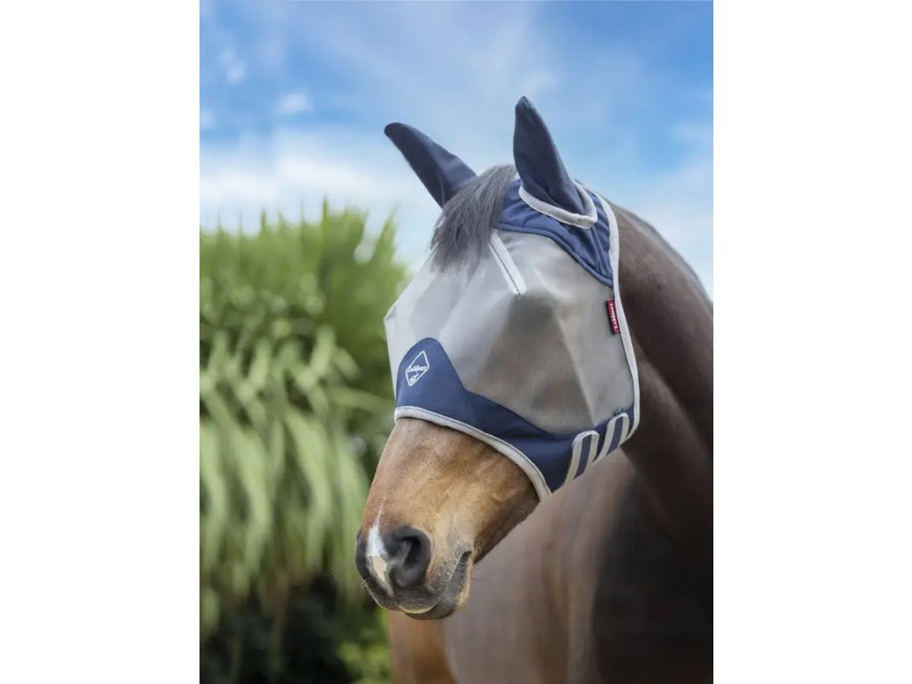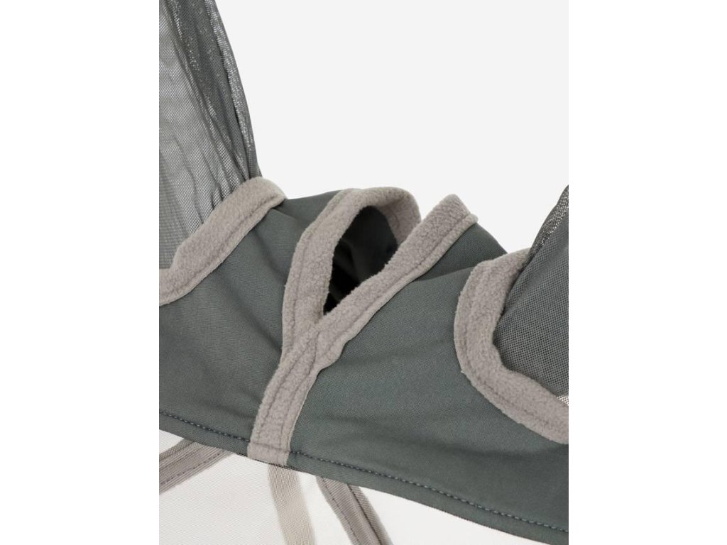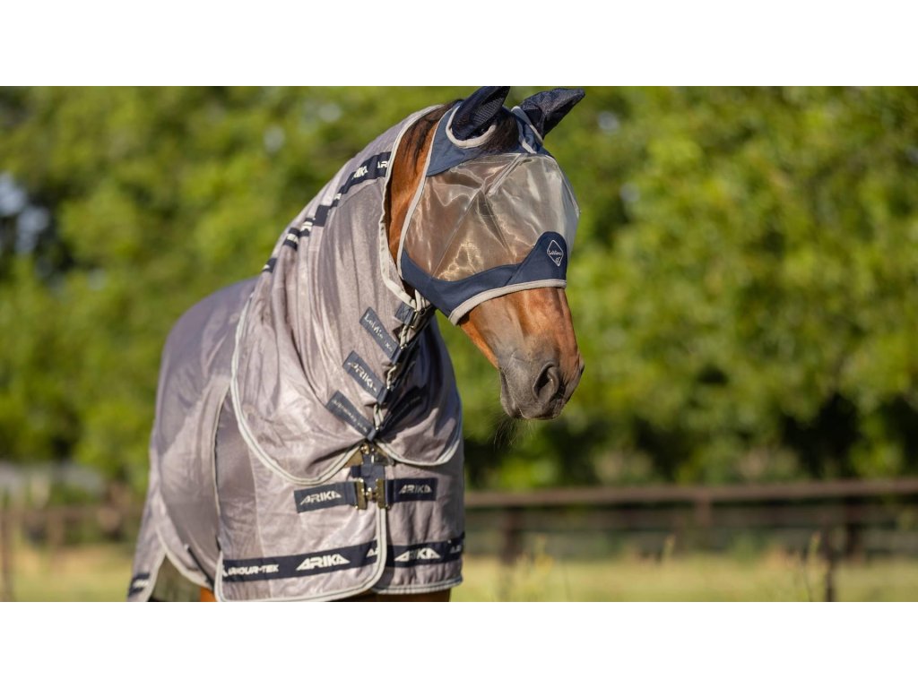 Nové a vylepšené masky Armour Shield Fly Mask mají nyní velkorysejší střih přes oči, tváře a týl, což umožňuje větší odstup přes obličej a lepší krytí. Stříbrná ochranná síťovina se 75% UV zářením poskytuje dobrou ochranu před nepříjemnými mouchami a zároveň poskytuje jasný a ničím nerušený výhled. Pohodlí je nejvyšší prioritou s měkkými prodyšnými bambusovými podšívkami přes čelo a nos. To pomáhá předcházet tření a zajišťuje volnost přes oči. Elastický týl a popruh na krk umožňují těsné a pevné uchycení při zachování pohodlí s měkkým fleecovým lemováním. Prodyšné uši ze síťoviny brání podráždění od much a komárů.